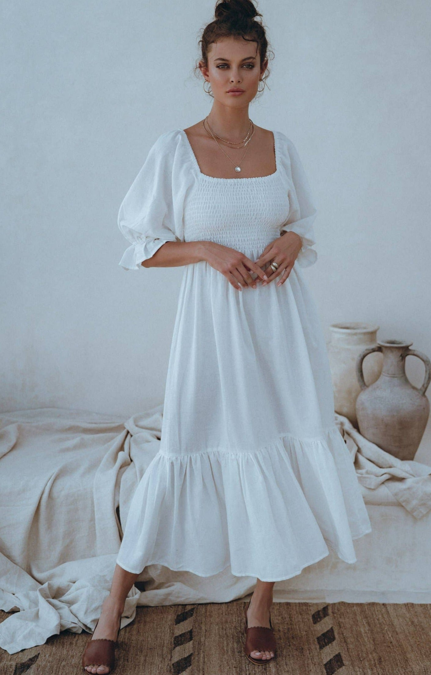 This smocked midi dress is the perfect breezy number to make a subtle statement. Handcrafted from 100% organic linen, it's trendy puffed sleeves, smocked bodice, and tiered hemline create a stylish and romantic look.
