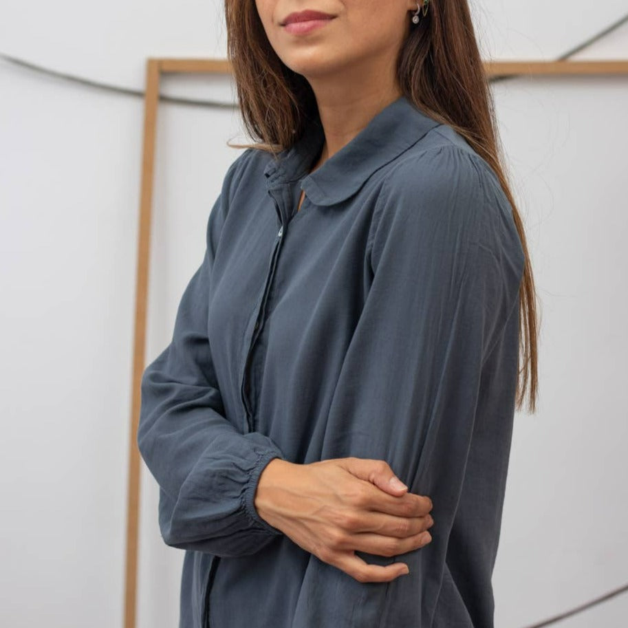 A relaxed garment that is comfortable but makes you appear well-dressed. Details such as its rounded neck and rubber cuffs make it very feminine and flattering. Long-sleeved blouse with rounded shirt collar and rubber detail on the cuffs. Hidden central buttons and soft U-shaped hems. Very lightweight cotton fabric with thin diagonal twill.