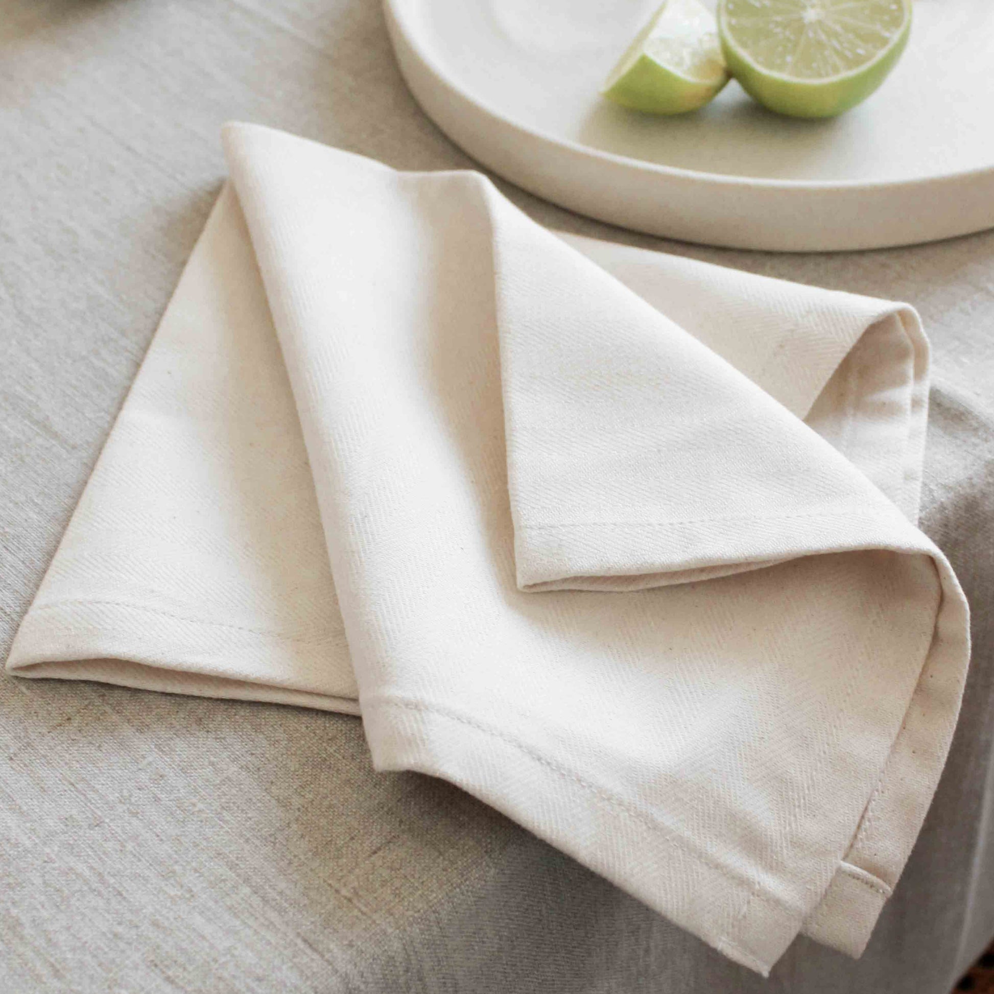 100% cotton with delicate herringbone jacquard detail. This fabric was carefully chosen to reduce environmental impact. These napkins will add the most elegant feel to any dining table!