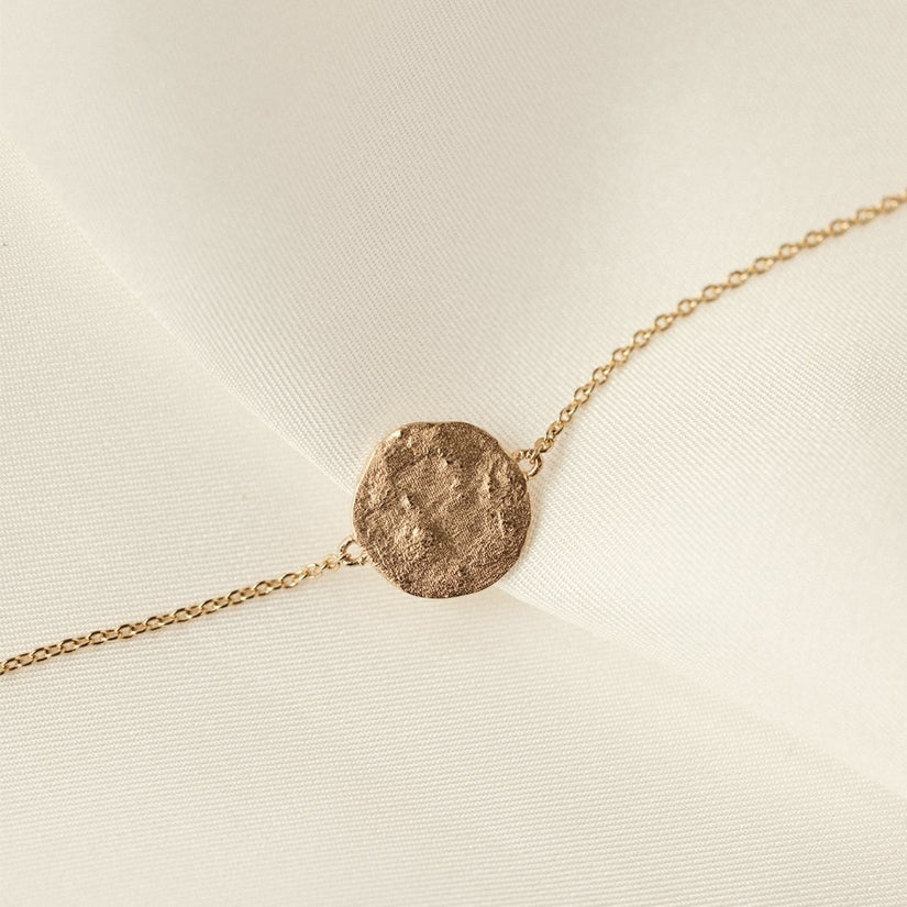 Minimalistic yet delicate, this bracelet seems to have been taken straight from an archeological excavation, turning it into a timeless treasure. 24K sustainable gold plated pendant and chain (gilding: satin). Ethically made in France in a Parisian workshop. 2-year guarantee & water-resistant. No risk of allergy (nickel-free, lead-free).