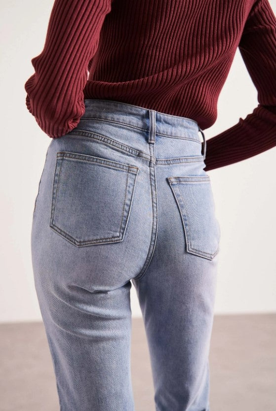 * High waist * 5 pockets * Zip and button closure * Belt loops * No rips