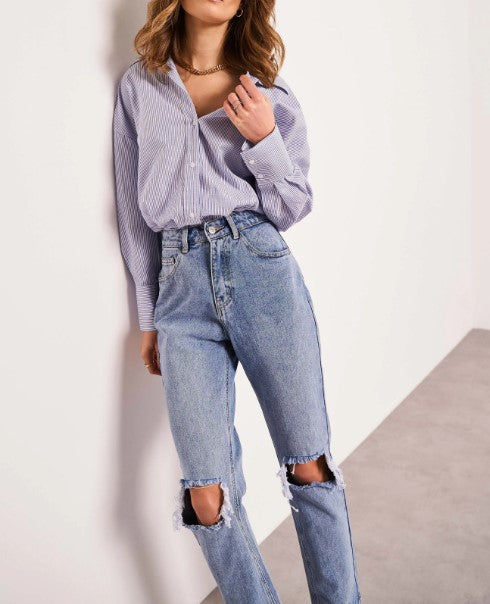 High waist * 5 pockets * Zip and button closure * Belt loops * Ripped at the knees