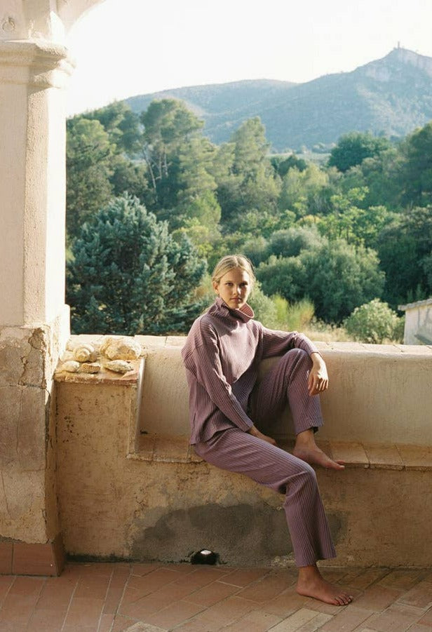Ribbed bell-length pants. Pair these with our Imola sweater for the most chic and comfy set! Mauve color that compliments any skin tone.