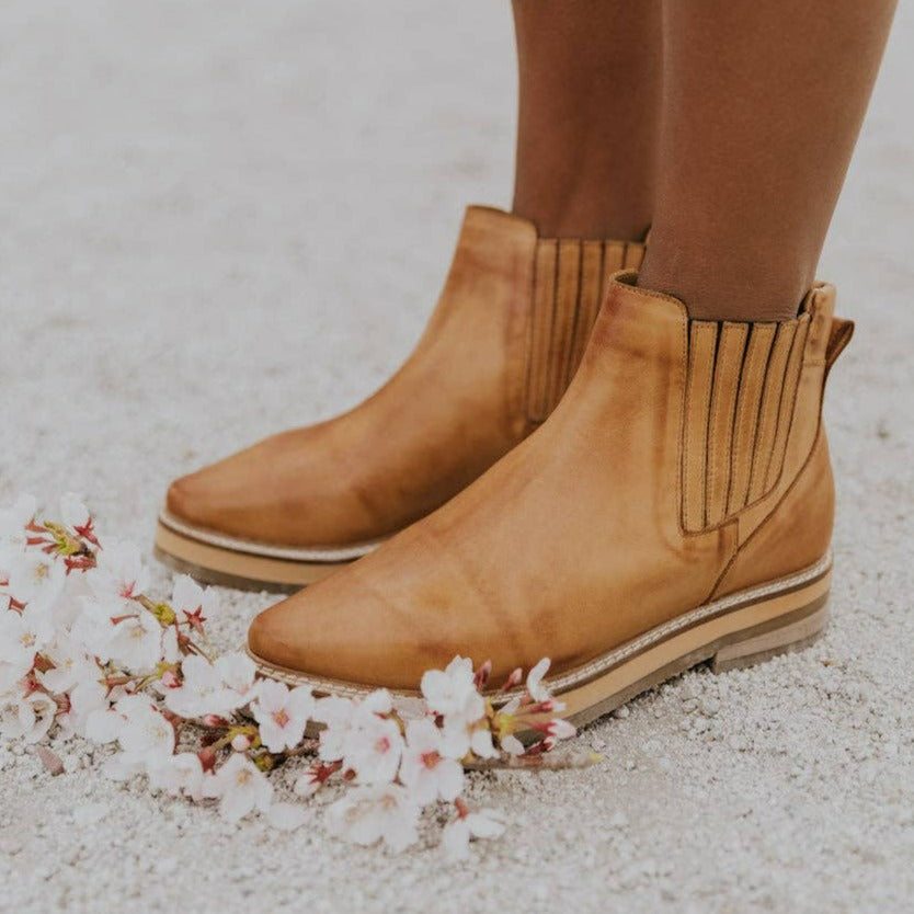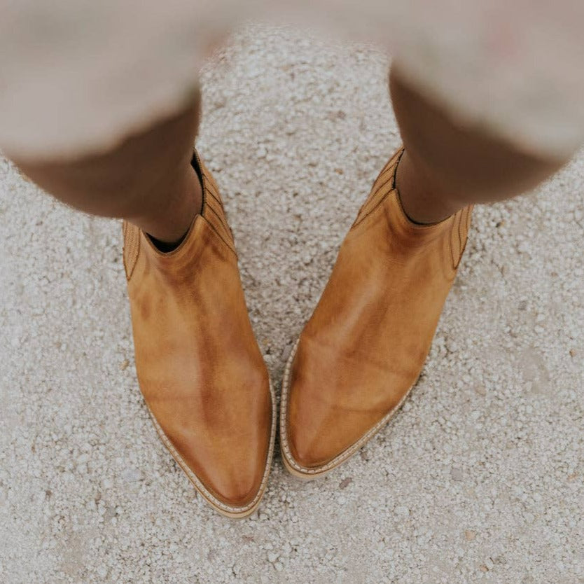 All leather Chukka boot. Built on a fashion pointed toe and features a padded sock liner and a midsole for extra comfort and flexibility. These slightly platformed booties are giving us all the feels. With a tan layered base, a pointed toe, and an easy slip-on pull tab, these booties are everything you'd want and more!